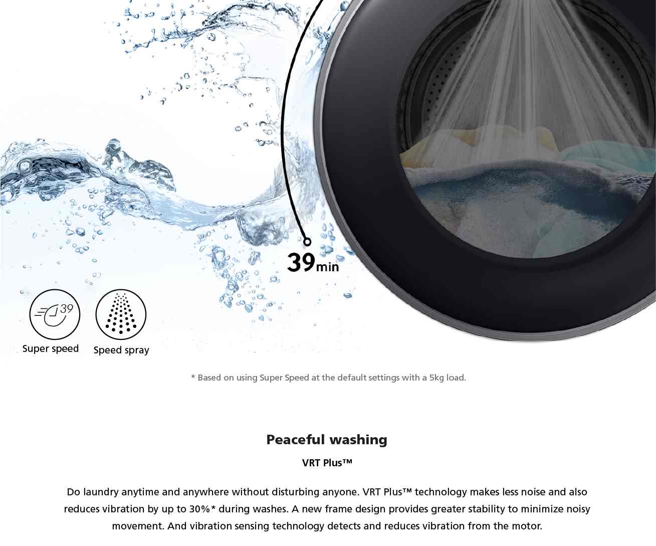 dengan teknologi innovative VRT Plus tiada lagi bunyi yang kuat semasa proses cucian,walaupun ketika proses spin